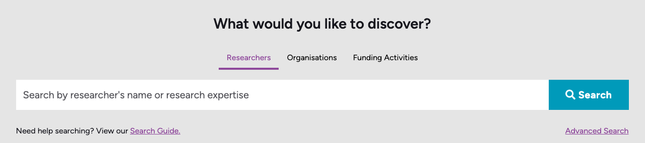 The search result page defaults to displaying records under the 'Researcher' tab. You can use the tab menu located on top of the Search Bar to modify this setting. his menu lists three available record types as options. electing any of these options before searching will ensure that the search result page presents the corresponding tab.